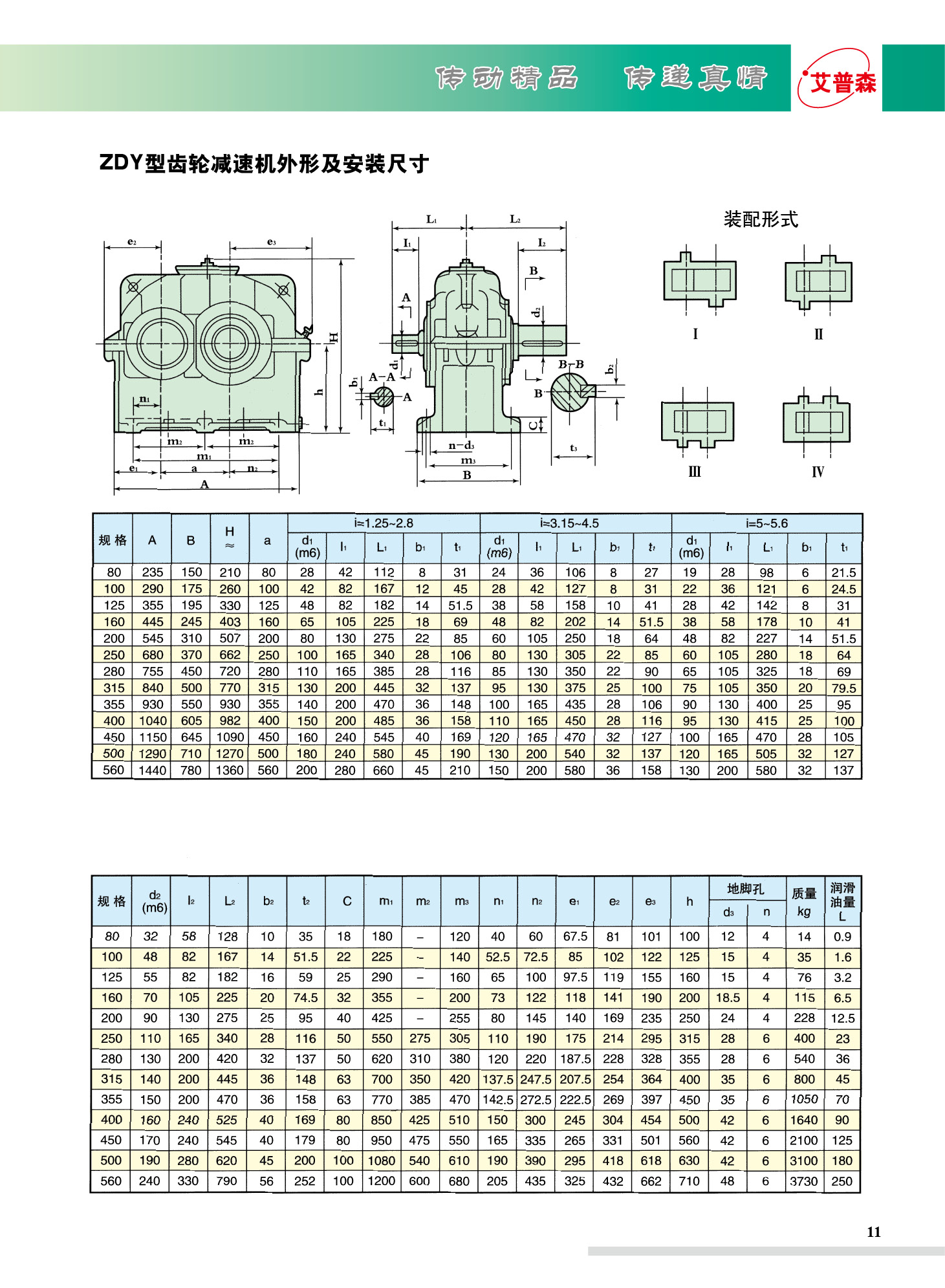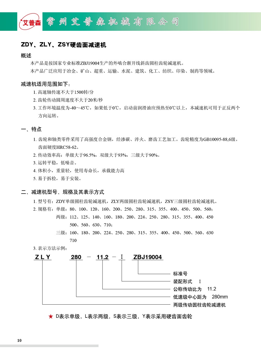 ZDY/ZLY/ZSY圓柱齒輪減速機(jī)減速機(jī)適用范圍如下: 1、高速軸轉(zhuǎn)不大于1500轉(zhuǎn)/分。 2、齒輪傳動(dòng)圓周速度不大于20米/秒。 3、工作環(huán)境溫度為-40~+45℃,如果低于0℃,啟動(dòng)前潤滑油應(yīng)預(yù)熱至0℃以上,本減速機(jī)可用于正反兩個(gè)方向運(yùn)轉(zhuǎn)。 一、特點(diǎn) 1.齒輪采用高強(qiáng)度低碳合金鋼經(jīng)滲碳淬火而成,齒面硬度達(dá)HRC58-62,齒輪均采用數(shù)控磨齒工藝,精度高,接觸性好。 2.傳動(dòng)率高:單級大于96.5%,雙級大于93%,三級大于90%。 3.運(yùn)轉(zhuǎn)平穩(wěn),噪音低。 4.體積小,重量輕,使用壽命長,承載能力高。 5.易于拆檢,易于安裝。 ZSY三級圓柱齒輪減速機(jī)規(guī)格型號有:ZSY160.ZSY180.ZSY200.ZSY224.ZSY250.ZSY280.ZSY315.ZSY355. ZSY400.ZSY450.ZSY500.ZSY560.ZSY630.